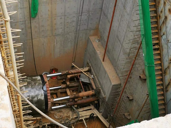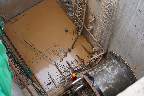 施工現場(chǎng)機器轟鳴,說(shuō)話(huà)需要提高分貝。一進(jìn)入施工現場(chǎng),就看到前方有一個(gè)沉井,沉井20米深、13.4*7.3米間方,這個(gè)沉井是挖掘井,在河的對岸還有一個(gè)深15.5米的接收井。從沉井圍欄邊看井底,下邊的工作人員都顯得特別的渺小,20米深的井相當于6層樓高,恐高的人都不敢往下看。