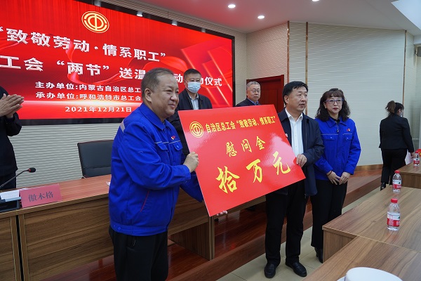 隨后,自治區總工會(huì )副主席傲木格同志發(fā)表了講話(huà)。自治區總工會(huì )黨組書(shū)記張慧宇宣布全區工會(huì )"兩節"送溫暖活動(dòng)正式啟動(dòng),并為市城市燃熱集團送上了十萬(wàn)元的慰問(wèn)金。