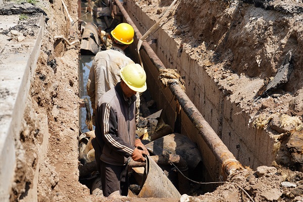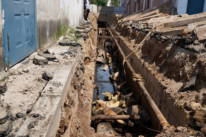 開(kāi)天花園小區施工直播結束后,我們直播組直奔如意小區供熱二次管網(wǎng)改造的施工現場(chǎng)。循著(zhù)一陣陣的臭味,我們來(lái)到了如意小區的A區一幼兒園后面,映入眼簾的是正在抽排污水的地溝,地溝中的供熱管線(xiàn)距污水水面非常近,污水在炎熱天氣的發(fā)酵下,臭氣熏天。工人們正在深溝里進(jìn)行排污及淤泥清理工作,每一個(gè)動(dòng)作都顯得格外艱難,衣服幾乎和污水一個(gè)顏色。