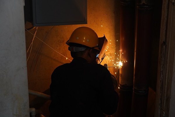 上午9:30時(shí),直播組來(lái)到開(kāi)天花園北區1號樓前,小區供熱主線(xiàn)的管溝內,一工人師傅穿著(zhù)長(cháng)褂,帶著(zhù)手套在狹小的空間內正嫻熟地進(jìn)行焊接,飛濺的火花下面,看不清楚他的臉,待焊接完一段后,他取下電焊面罩,露出一張黑紅黑紅的臉,汗水順著(zhù)額頭直瀉而下,汗珠吧嗒吧嗒流在眼里、滴到了地上,不時(shí)用衣袖擦眼睛。他告訴筆者,地面溫度是36°,他焊接的周邊溫度要達到50多度。面對高溫的"烤"驗,他全然不顧,用他的話(huà)說(shuō):這是他們的工作常態(tài),早已習慣。